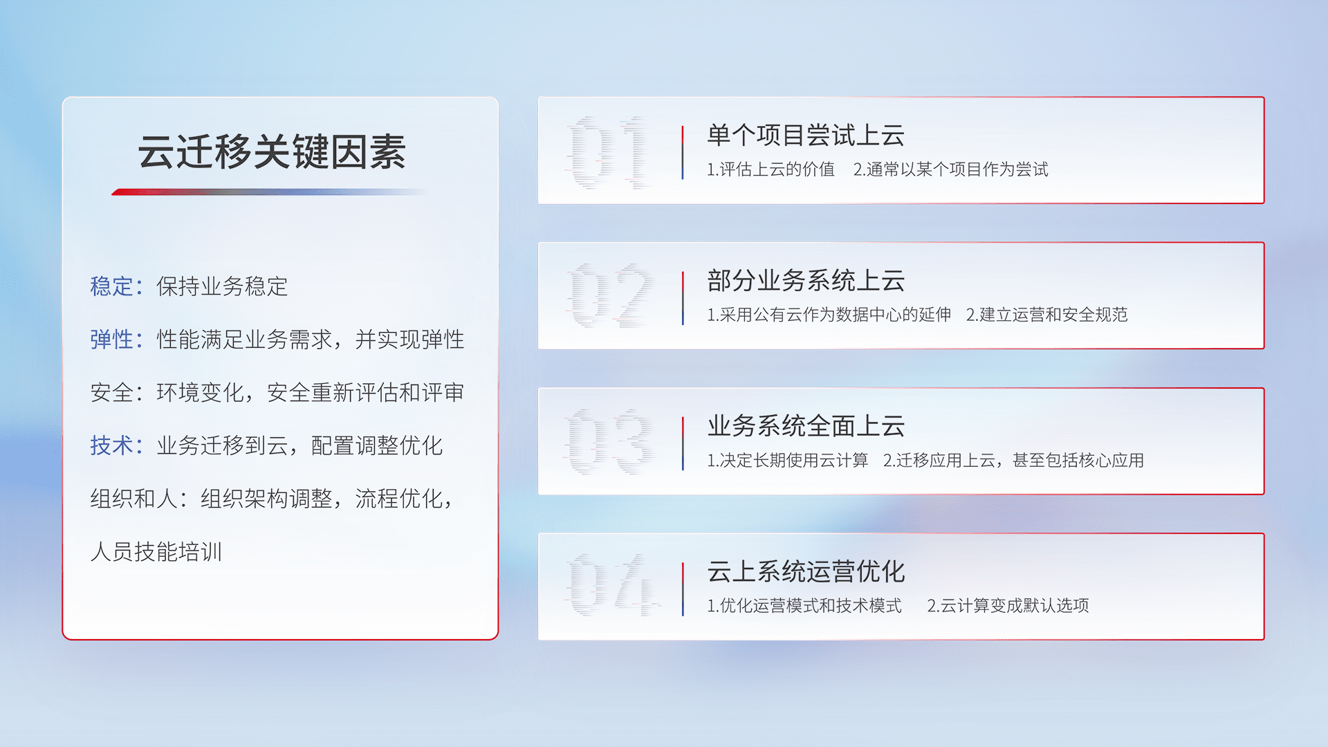 结合实际业务,,从规划设计、、云平台选型、、、、云原生改造、、数据迁移、、集成交付,,,迁移全过程为客户识别最佳上云路径,,,做好风险识别管理,,设计网络架构、、身份权限、、、安全审计合规、、、操作审计、、日志审计、、、、监控告警策略、、、多站点容灾设计等,,对云上基础设施进行整体规划,,,,提升IT治理水平,,以满足弹性、、高可用、、、、高性能的需求。。。。